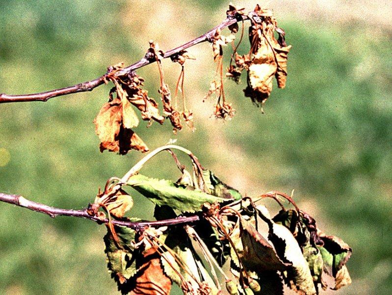 Květy hnědnou a zasychají. Napadené jsou také větévky, kde části nad postiženým místem také zavadají a uschlé listy zůstávají na větévkách viset. Často se vyskytuje klejotok.